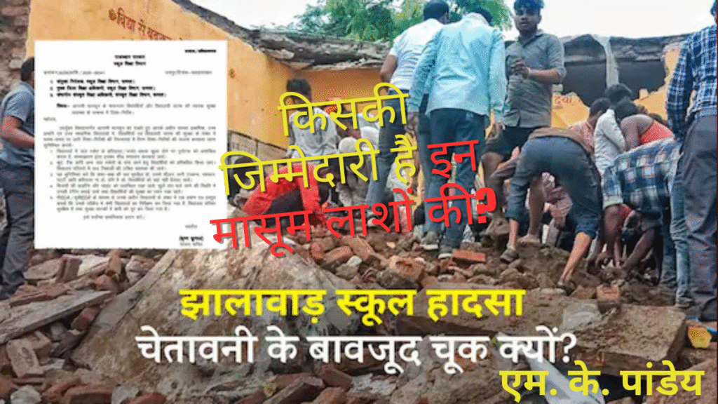 झालावाड़, राजस्थान | पिपलोदी गांव में एक सरकारी स्कूल की छत गिरने से 7 मासूम बच्चों की मौत और 28 से अधिक बच्चों के घायल होने की खबर ने पूरे देश को झकझोर दिया है। लेकिन यह केवल एक दुर्घटना नहीं है — यह सरकारी तंत्र की लापरवाही और संवेदनहीनता से उपजा हत्याकांड है। यह उन बच्चों की हत्या है जिन्हें शिक्षा के नाम पर सरकारी खंडहरों में बैठा दिया गया और जिनकी जान की कीमत सिर्फ एक मुआवजे में तय कर दी गई।
