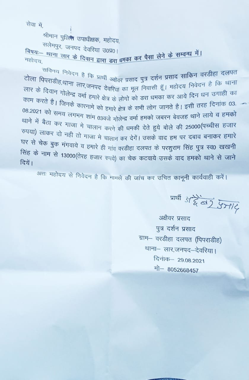थाने के कारखास हेड कांस्टेबिल गोलेन्द्र वर्मा पर रविवार को एक और शिकायत हुई। पिपरिडीह गाव के अक्षयवर प्रसाद ने सीओ सलेमपुर को एक शिकायती पत्र देकर आरोप लगाया है कि उक्त हेड कांस्टेबिल गांजा में चालान करने की धमकी देकर एक दूसरे व्यक्ति के नाम से 13 हजार का चेक कटवा कर लिए । अब देखना यह है कि जांच में क्या कार्रवाई होती है।