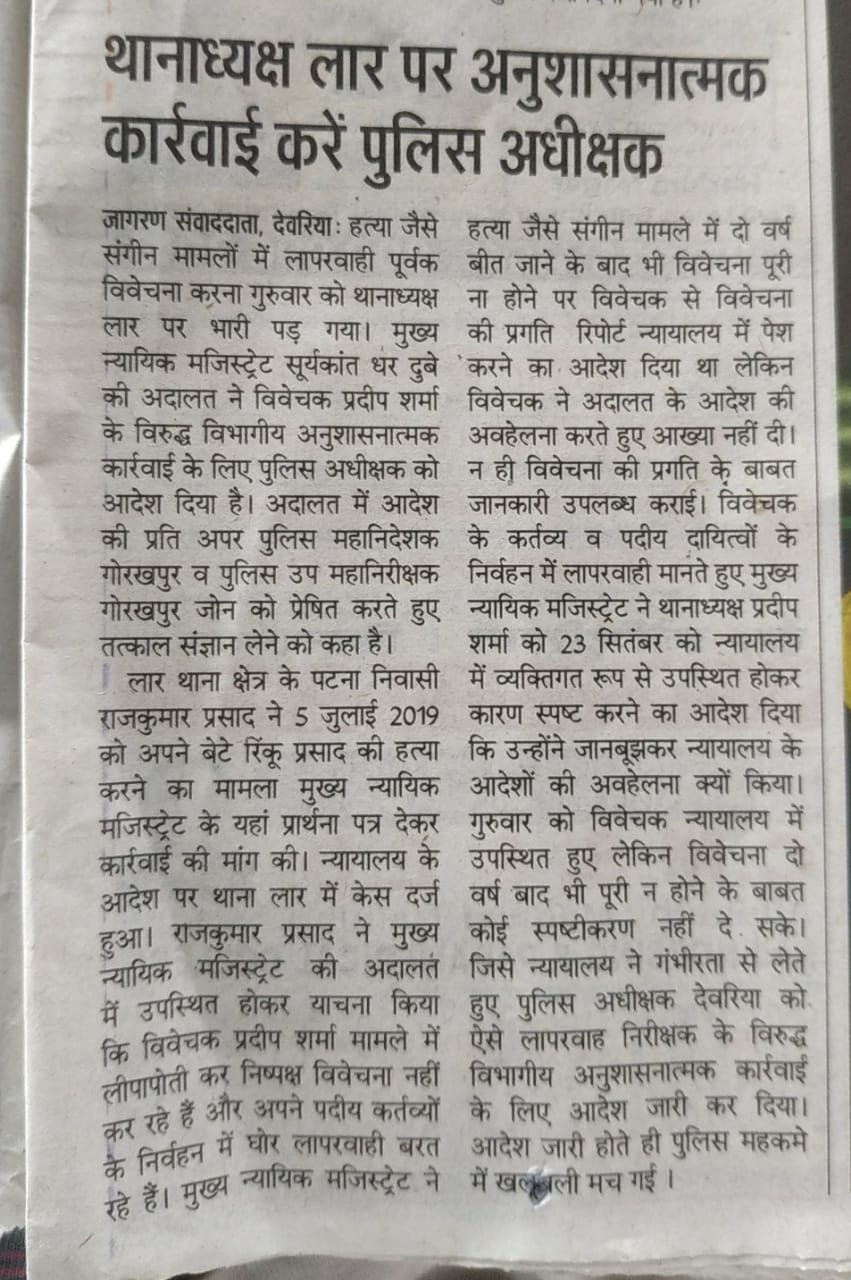 देवरिया। जिले के लार थानाध्यक्ष की लापरवाही को मुख्य न्यायायिक मजिस्ट्रेट सूर्यकांत धर दुबे की अदालत ने सज्ञान लिया है। कोर्ट ने लार थानाध्यक्ष प्रदीप शर्मा के विरुद्ध विभागीय कार्रवाई के लिए पुलिस महानिदेशक गोरखपुर, पुलिस उपमहानिरीक्षक गोरखपुर को उस आदेश की प्रति प्रेषित किया है जिसमें कोर्ट ने एसपी देवरिया को एसओ लार के विरुद्ध विभागिय कार्रवाई का आदेश दिया है। एसओ पर आरोप है कि वे लार थाना क्षेत्र के पटना गाव निवासी राज कुमार प्रसाद के बेटे रिंकू की हत्या के मामले में सही विवेचना नही कर रहे हैं।