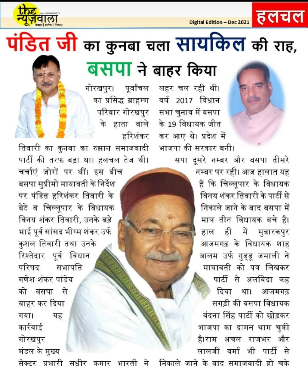 गोरखपुर। पूर्वांचल का प्रसिद्ध ब्राहम्ण परिवार गोरखपुर के हाता वाले हरिशंकर तिवारी का कुनबा का रुझान समाजवादी पार्टी की तरफ बढ़ा था। हलचल तेज थी। चर्चाएं जोरों पर थीं। इस बीच बसपा सुप्रीमो मायावती के निर्देश पर पंडित हरिशंकर तिवारी के बेटे व चिल्लूपार के विधायक विनय शंकर तिवारी, उनके बड़े भाई पूर्व सांसद भीष्म शंकर उर्फ कुशल तिवारी तथा उनके रिश्तेदार पूर्व विधान परिषद सभापति गणेश शंकर पांडेय को बसपा से बाहर कर दिया गया। यह कार्रवाई गोरखपुर मंडल के मुख्य सेक्टर प्रभारी सुधीर कुमार भारती ने सोमवार की देर रात की। बसपा की इस कार्रवाई को लोग कोरम पूरा करने की बात कह रहे। हाता परिवार के सपा से नजदीकियां बढ़ने की खबरें तो एक माह से चल रहीं थीं। ऐसे में बसपा से बाहर करने की कार्रवाई महज खानापूरी है।
