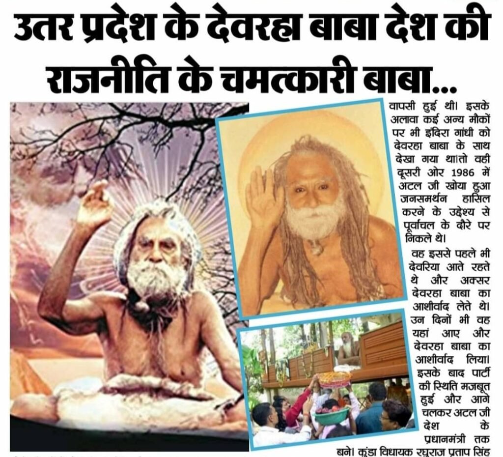 कमलेश शर्मा , जयपुर। वैसे तो लोगों के जीवन में कई गुरु अपना अपना अहम स्थान रखते हैं, लेकिन बात जब राजनीतिक गुरु की हो और उसके चमत्कारी आशीर्वाद की तो उतर प्रदेश के देवरहा बाबा का नाम प्रमुखता के साथ आता है. माना जाता है कि 1977 में जब इंदिरा गांधी चुनाव हार गई थीं, तब वे देवरहा बाबा से आशीर्वाद लेने गई थीं। बाबा ने उन्हें हाथ उठाकर पंजे से आशीर्वाद दिया था।यही वजह थी कि जब इंदिरा ने चुनाव लड़ा तो उन्होंने कांग्रेस का निशान पंजा ही तय किया था। साल 1980 में हुए चुनावों में इंदिरा गांधी को शानदार जीत मिली और एक बार फिर उनकी सत्ता में वापसी हुई थी। इसके अलावा कई अन्य मौकों पर भी इंदिरा गांधी को देवरहा बाबा के साथ देखा गया था।तो वही दूसरी ओर 1986 में अटल जी खोया हुआ जनसमर्थन हासिल करने के उद्देश्य से पूर्वांचल के दौरे पर निकले थे। वह इससे पहले भी देवरिया आते रहते थे और अक्सर देवरहा बाबा का आशीर्वाद लेते थे। उन दिनों भी वह यहां आए और देवरहा बाबा का आशीर्वाद लिया। इसके बाद पार्टी की स्थिति मजबूत हुई और आगे चलकर अटल जी देश के प्रधानमंत्री तक बने। कुंडा विधायक रघुराज प्रताप सिंह भी अपनी लगातार जीत का पूरा श्रेय बाबा के आशीर्वाद को ही देते हैं.