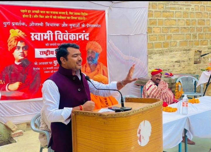 महेंद्र सिंह, जैसलमेर | स्वामी विवेकानंद जी की जयंती एवं युवा दिवस पर श्री पनराज जी मंदिर युवा सम्मेलन के दौरान आईदान सिंह भाटी ने स्वामी विवेकानंद जी के जीवनी एवं उनकी कार्यशैली के बारे में विस्तार से जानकारी दी, कहा कि स्वामी विवेकानंद के आदर्शों को आज की युवा पीढ़ी को अपनाना चाहिए एवं उनके आदर्शों पर चलकर हिंदुस्तान का विकास करें , भाटी ने कहा कि युवाओं को कभी भी मायूस नहीं होना चाहिए स्वयं पर विश्वास रखकर अपने लक्ष्य की प्राप्ति करें सकारात्मक सोच के साथ युवा अपने कार्य को पूर्ण करें उन्होंने कहा कि आज के युग में युवाओं को अपने लक्ष्य को तय करना सीखना चाहिए जिन जिन युवाओं ने अपना लक्ष्य तय किया है वह निश्चित रूप से अपने लक्ष्य तक पहुंचे हैं ऐसे कई उदाहरण सामने नजर आ रहे हैं आज की युवा पीढ़ी सकारात्मक सोच के साथ लक्ष्य को हासिल करने की विशेष नीति बनाएं ताकि लक्ष्य से भटकाव ना हो इस अवसर पर सैकड़ों की संख्या में युवा वह ग्रामीण उपस्थित रहे युवा सम्मेलन को संबोधित करते हुए भाटी ने युवाओं को गलत संगति एवं नशे पत्ते से दूर रहने की सलाह दी और कहां की परिवार में कोई भी सदस्य नशा करता है तो उसे छुड़वाने का प्रयास करें इस उपरांत भाटी ने युवाओं को बताया की सफलता प्राप्त करने के लिए शुरू से ही अपना लक्ष्य तय करें अगर आपने लक्ष्य तय करके आगे कार्य या पढ़ाई की तो आपको सफल होने से कोई नहीं रोक सकता