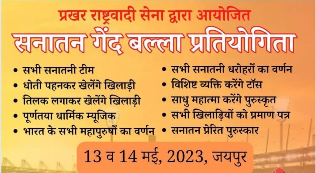 प्रखर राष्ट्रवादी सेना, राजस्थान के अध्यक्ष अक्षय राष्ट्रवादी ने बताया कि इस सनातन गेंद बल्ला प्रतियोगिता के दौरान खिलाड़ी धोती-कुर्ता पहनकर क्रिकेट खेलते नजर आयेगे। महासचिव प्रभात राष्ट्रवादी ने बताया कि इस प्रतियोगिता में जो खिलाड़ी हिस्सा ले रहे है वो सनातन को मजबूत करने का कार्य करेगे, जो माथे पर तिलक लगाकर, रुद्राक्ष पहनकर और पारम्परिक पोशाक में क्रिकेट खेलते नज़र आयेगे। यही नहीं, इस मैच में विजेता को हमारे सनातन संत पुरस्कार और आशीर्वाद देगें।