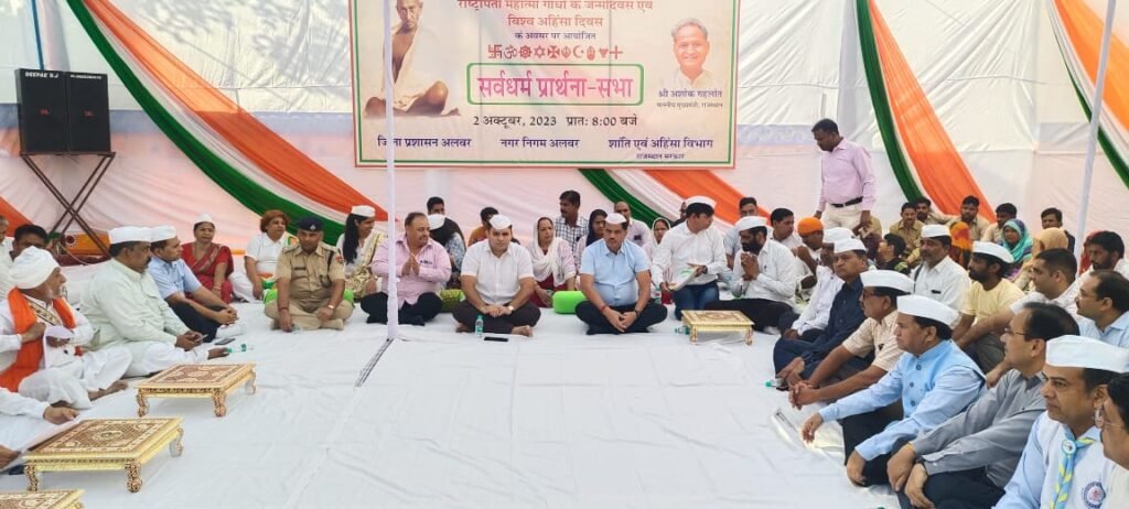 अलवर 2 अक्टूबर। राष्ट्रपिता महात्मा गांधी और पूर्व प्रधानमंत्री लालबहादुर शास्त्री की जयंती के अवसर पर शांति और अंहिसा विभाग राजस्थान सरकार, जिला प्रशासन एवं नगर निगम के संयुक्त तत्वावधान में सोमवार को नगर निगम कार्यालय में कार्यक्रम आयोजित हुआ जिसमें सर्वधर्म प्रार्थना सभा और रामधुनी का आयोजन किया गया।