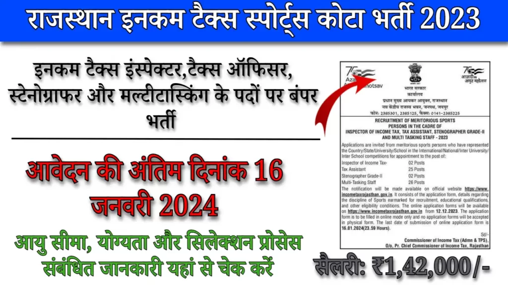 Income Tax Sports Quota Recruitment 2023: यदि आप भी 10वीं, 12वीं या स्नातक पास है औऱ स्पोर्ट्स कोटा से आते है तो आपके लिए आयकर विभाग ने, नई स्पोर्ट्स कोटा भर्ती को जारी किया है जिसके तहत आवेदन करके आप आयकर विभाग मे नौकरी करने के अपने सपने को पूरा कर सकते है और इसीलिए हम, आपको इस लेख मे विस्तार से Income Tax Sports Quota Recruitment 2023 के बारे में बतायेगे।