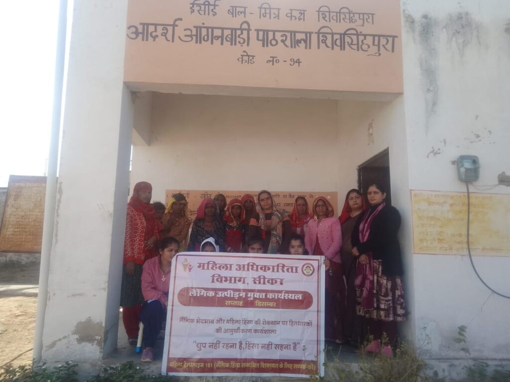 सीकर 22 दिसम्बर। महिला अधिकारिता विभाग की सहायक निदेशक डॉ अनुराधा सक्सेना के निर्देशानुसार आंगनबाड़ी केंद्र संख्या 94 वार्ड नंबर 5 शिवसिंहपुरा मे बेटी बचाओ, बेटी पढ़ाओ योजना अन्तर्गत बालिकाओं व महिलाओं के विरुद्ध हिंसा को रोकने के लिए लैंगिक उत्पीडन मुक्त कार्यस्थल सप्ताह का आयोजन किया गया। इंदिरा महिला शक्ति केन्द्र की मनोसामाजिक परामर्शदाता रीचा पारीक द्वारा बालिकाओं को हिंसा के विभिन्न प्रकारों से अवगत करवाते हुए इसकी रोकथाम के लिए गठित की जाने वाली समिति के बारे में बताया गया। सामाजिक परामर्शदाता राजेश कुमारी द्वारा उपस्थित बालिकाओ को माहवारी स्वच्छता से संबंधित साफ—सफाई सेनेटरी नैपकिन का उपयोग करने के बाद बाद डिस्पोज़ कहा करना चाहिए कि जानकारी देते हुए किशोरावस्था में होने वाले शारीरिक मानसिक परिवर्तनो के प्रति जागरूक करते हुए बताया कि माहवारी कोई बीमारी नहीं हैं यह एक प्राकृतिक प्रक्रिया हैकी जानकारी दी। कार्यक्रम में ग्राम साथिन पूजा देवी, कार्यकर्ता सविता देवी, सहायिका राधा देवी भी उपस्थित रहीं।