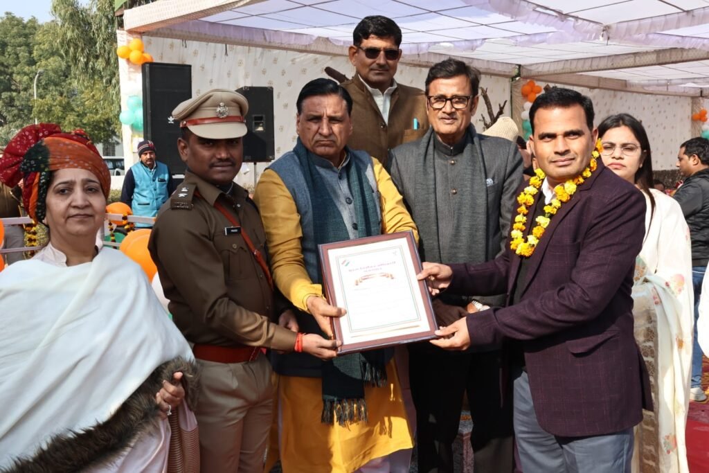 चूरू, 27 जनवरी। जिला स्वीप कॉर्डिनेटर रमेश सिसोदिया व निर्वाचन शाखा के गोविंद राहड़ को शुक्रवार को जिला मुख्यालय पर पुलिस लाईन में आयोजित गणतंत्र दिवस समारोह में राज्य स्तरीय पुरस्कार से सम्मनित किया गया। समारोह में जिला कलेक्टर पुष्पा सत्यानी, पुलिस अधीक्षक प्रवीण नायक नूनावत, विधायक हरलाल सहारण व पूर्व मंत्री राजेन्द्र राठौड़, एडीएम उत्तमसिंह श्ेखावत, सभापति पायल सैनी, प्रधान दीपचंद राहड़, ने रमेश सिसोदिया व गोविंद राहड़ को निर्वाचन विभाग की ओर से प्रशस्ति-पत्र भेंट कर सम्मानित किया।