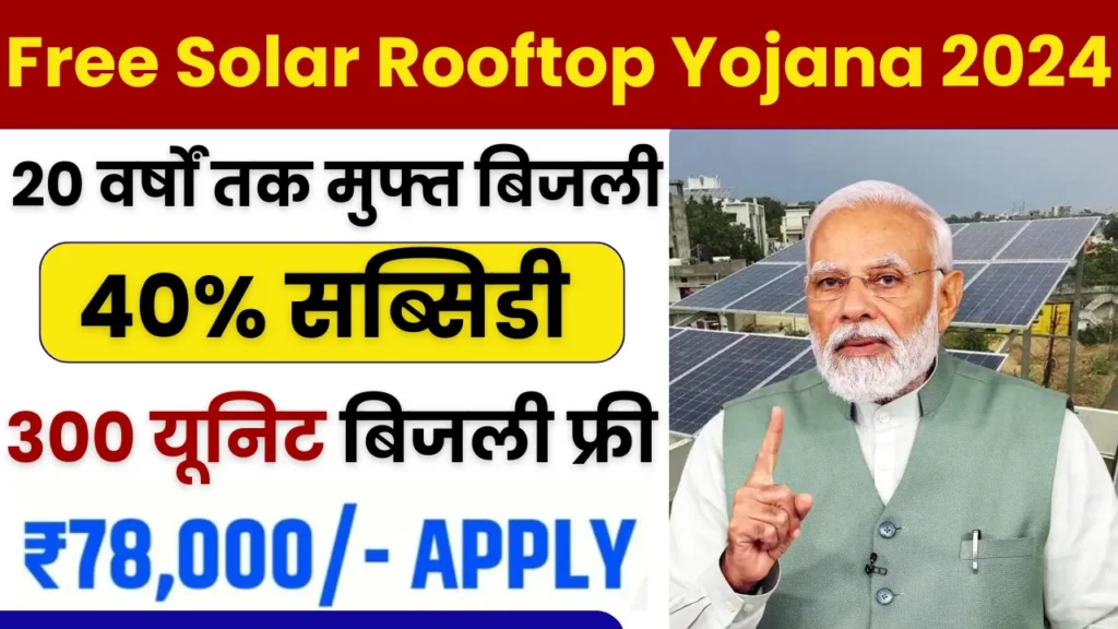 Free Solar Rooftop Yojana 2024 : सरकार द्वारा फ्री सोलर रूफटॉप योजना की शुरुआत की गई है। जैसे-जैसे भारत की जनसंख्या बढ़ रही है, वैसे-वैसे ऊर्जा की आवश्यकता भी बढ़ रही है। ऊर्जा की बढ़ती हुई मांग उद्योगों के लिए चुनौतियों को खड़ा करती है। वर्तमान समय में प्रत्येक क्षेत्र में सौर ऊर्जा को संचालित किए जाने का प्रयास किया जा रहा है। आज के दौर में अधिक मात्रा में प्राकृतिक संसाधनों की जगह सौर ऊर्जा जैसे नवीनतम ऊर्जा संसाधनों को प्रयोग करने की आवश्यकता है। भारत में ऐसे बहुत से व्यक्ति है, जो बिजली बिल का भुगतान समय पर नहीं कर पाते हैं।